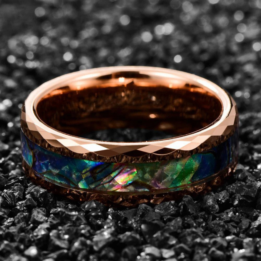 Orionis is where cosmic beauty meets refined craftsmanship. Set in a faceted rose gold-colored tungsten band, the center features abalone shell — glowing with iridescent blues, greens, and purples like the shifting sky. The precision-cut edges catch the light with every movement, adding a touch of luxury to a ring grounded in nature’s most dazzling textures. A rare balance of strength and brilliance, Orionis is made for those who carry light with them.