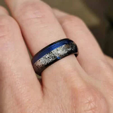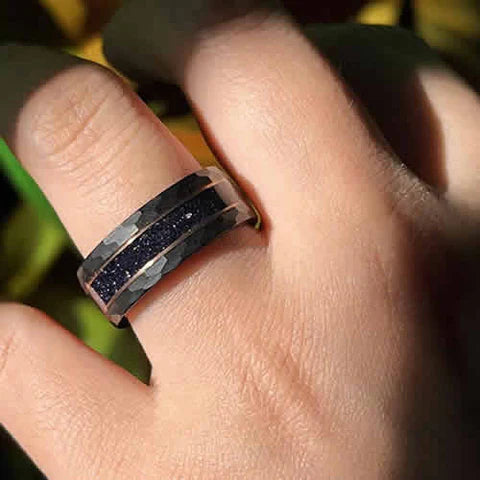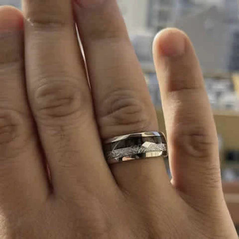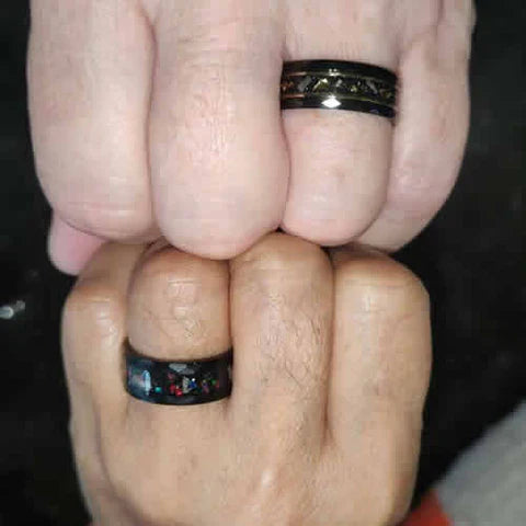 Vortex draws you in with its bold contrast and hypnotic detail. Crafted from polished tungsten carbide, this ring features a triple-channel inlay with black obsidian-like texture and vibrant crushed opal fragments in deep purples, blues, and greens. The swirling colors and layered design evoke the intensity of a cosmic vortex — powerful, rare, and endlessly captivating. For those who lead, not follow, Vortex is the ultimate expression of edge and individuality.