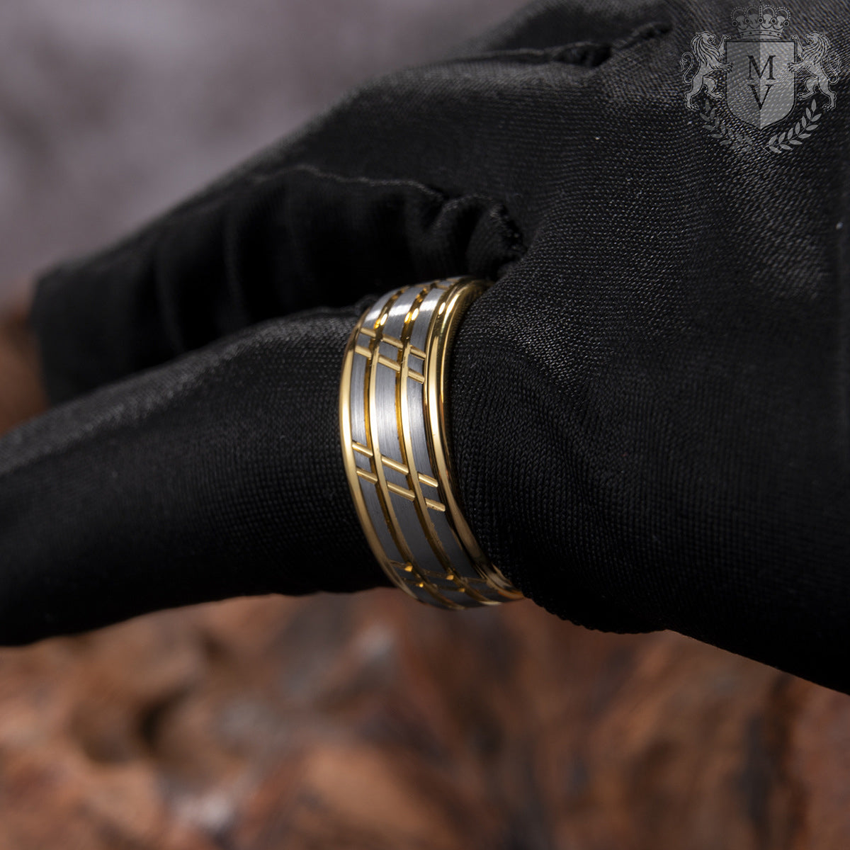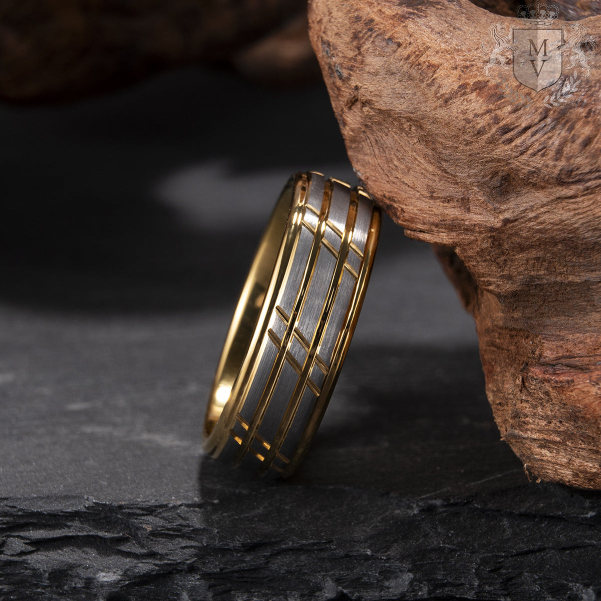 Bravado is a ring that commands attention with its bold contrast and refined craftsmanship. The fusion of brushed silver tungsten carbide with intricate gold-accented grooves creates a striking balance between strength and sophistication. The 18K gold-plated interior adds a touch of luxury, making this ring the perfect symbol of confidence and resilience. Whether worn as a statement piece or a wedding band, Bravado represents unwavering style and character.