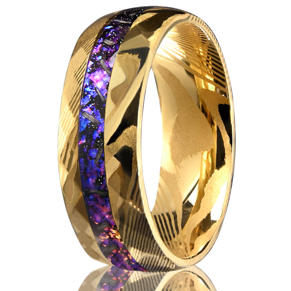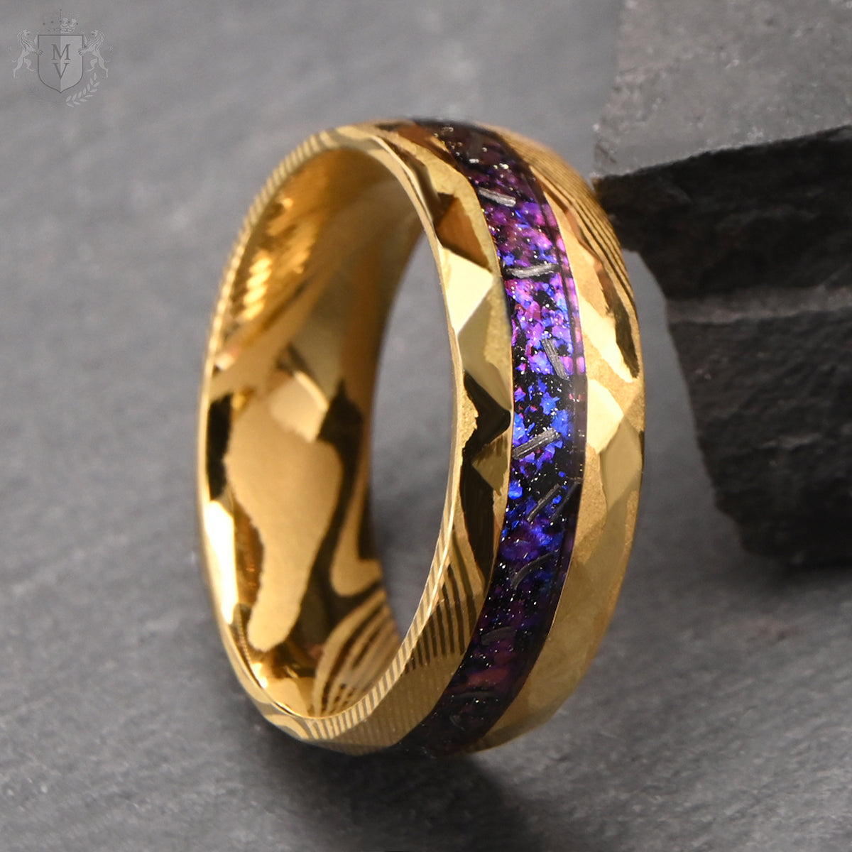 Caelith is a ring that feels otherworldly — forged from gold and steel, yet glowing with something beyond. Crafted from Damascus steel and plated in 18k gold, its core is streaked with a shimmering inlay of purple crystal and meteorite-like fragments, catching light like a night sky on fire. Each detail is a reflection of cosmic beauty and raw power. Caelith was made to stand out — radiant, mysterious, infinite.