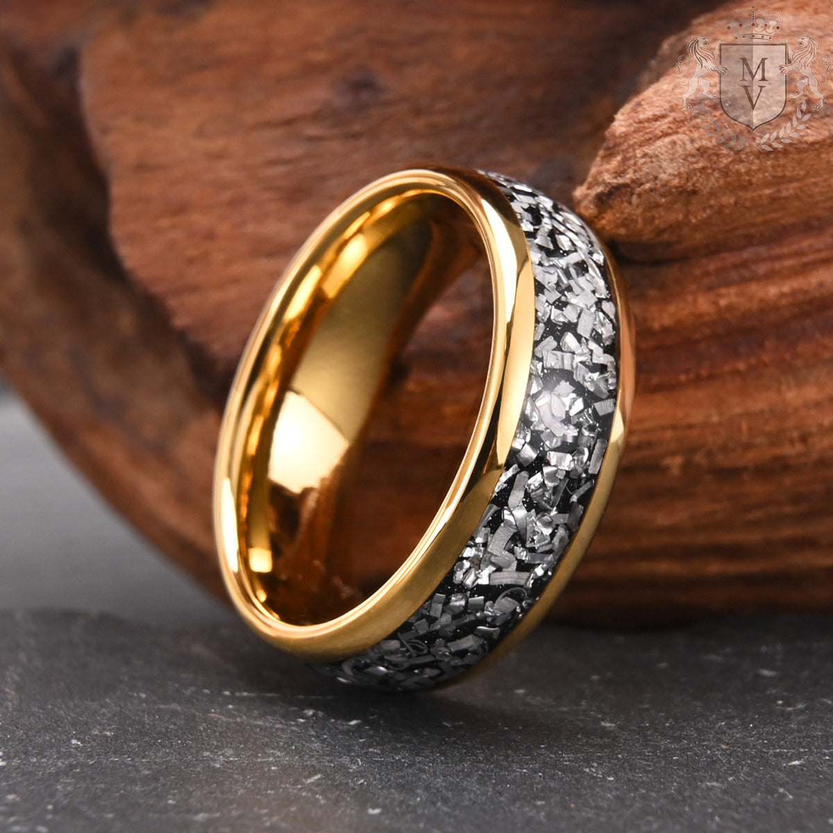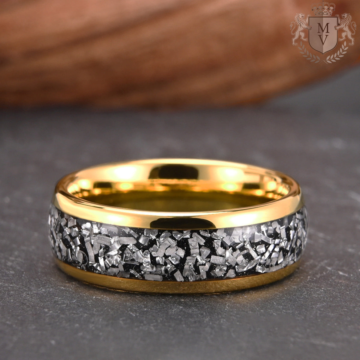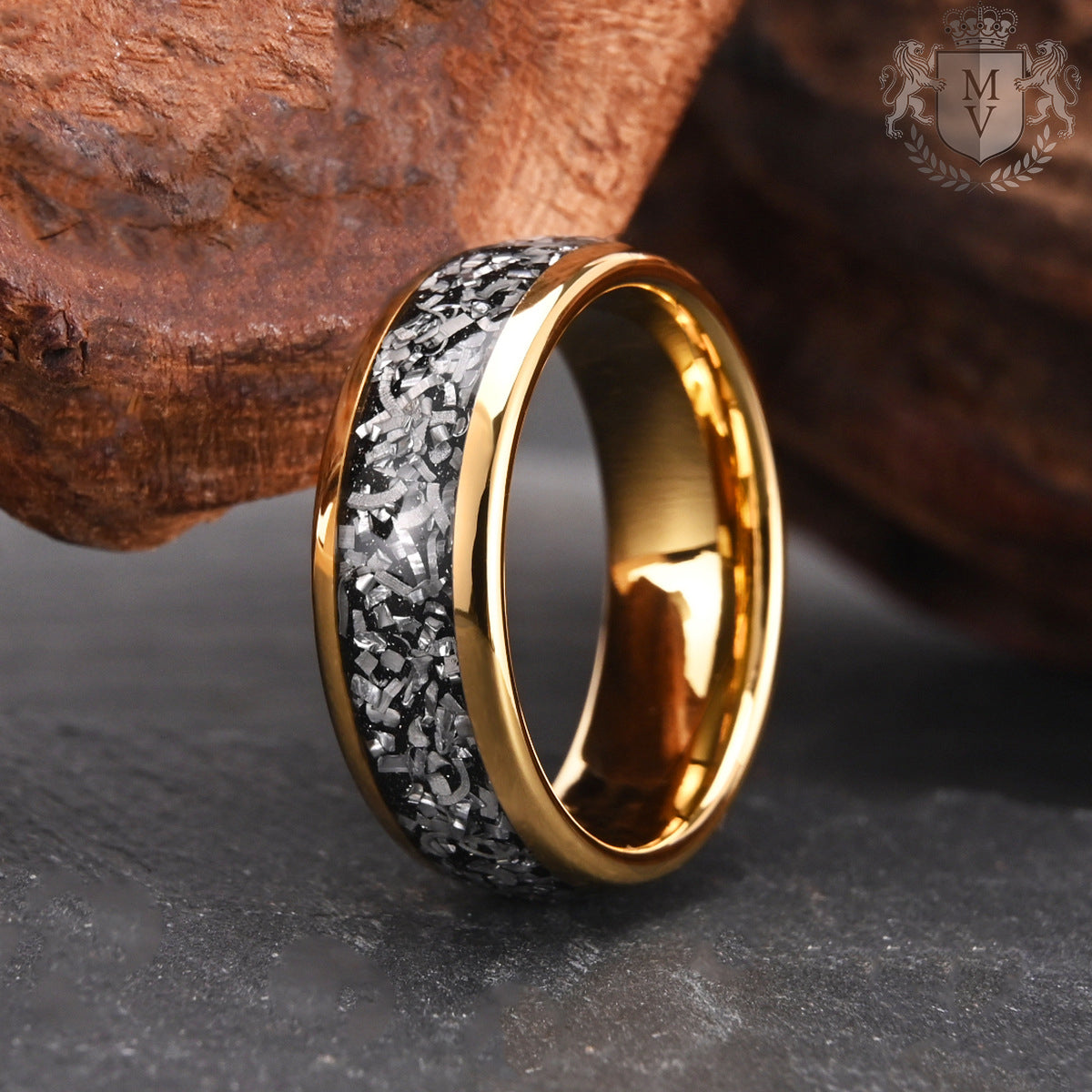 Materials: 18K gold-plated tungsten carbide, meteorite inlay.