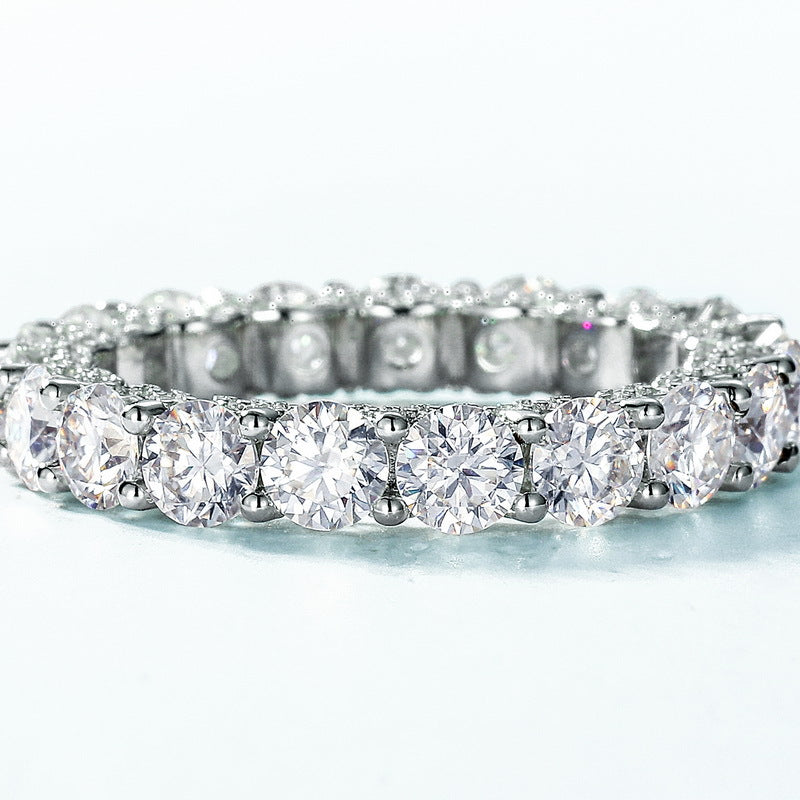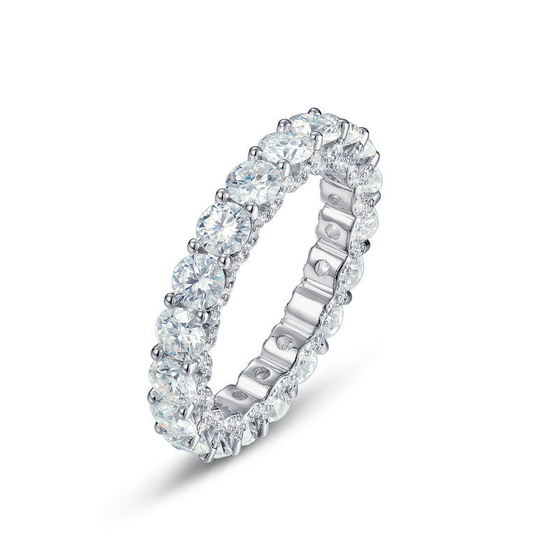 Aeris is a celebration of everlasting light. Set with a full circle of round brilliant-cut moissanite stones totaling 3.74 carats, this eternity ring dazzles from every angle. Crafted from solid S925 sterling silver, each stone is held securely in a classic four-prong setting that maximizes brilliance while maintaining refined elegance. Whether worn alone, stacked, or as a meaningful symbol of eternal love, Aeris brings a radiant presence that never fades — timeless, powerful, and impossible to overlook.