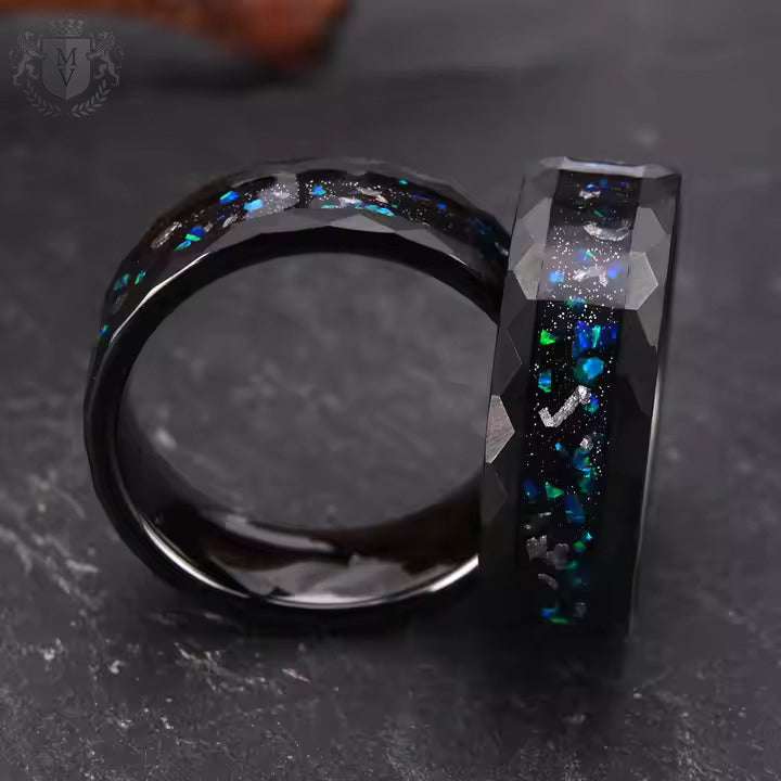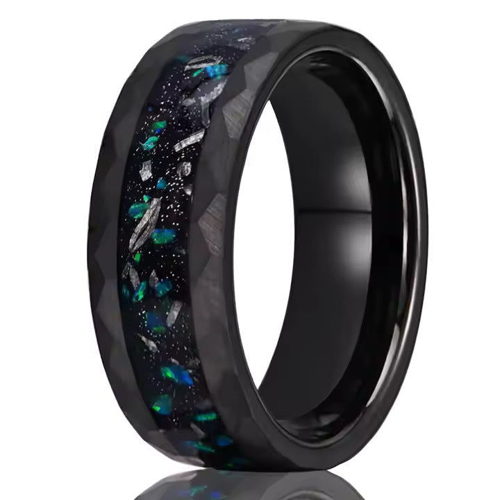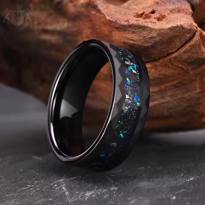 Astrax is forged for those who move in silence but carry gravity. Crafted from faceted black tungsten, its inlay swirls with crushed opal fragments that shift from green to blue — like stardust suspended in space. Light dances across its polished surface, while tiny mineral flecks sparkle like distant constellations. Bold, modern, and otherworldly, Astrax is made to orbit outside the ordinary.