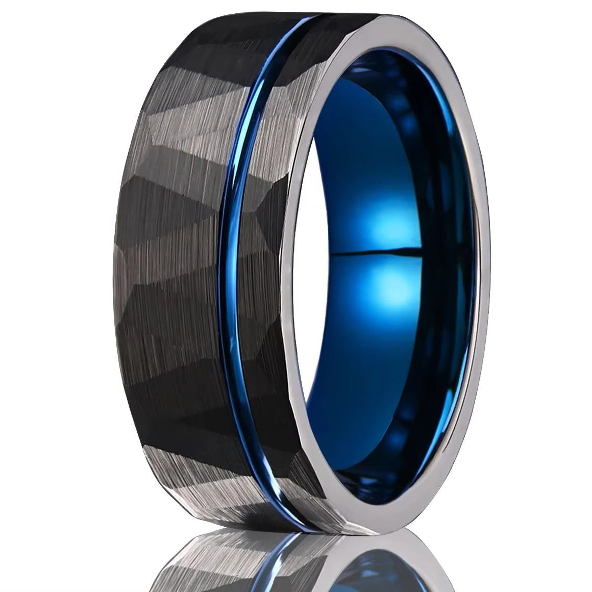 The Azric Ring embodies power and precision with a striking design. Crafted from tungsten carbide, its bold black exterior is enhanced by a vivid electric blue inlay and polished interior. The faceted surface catches light at every angle, while the blue accents add depth and character — a modern edge to a timeless form.