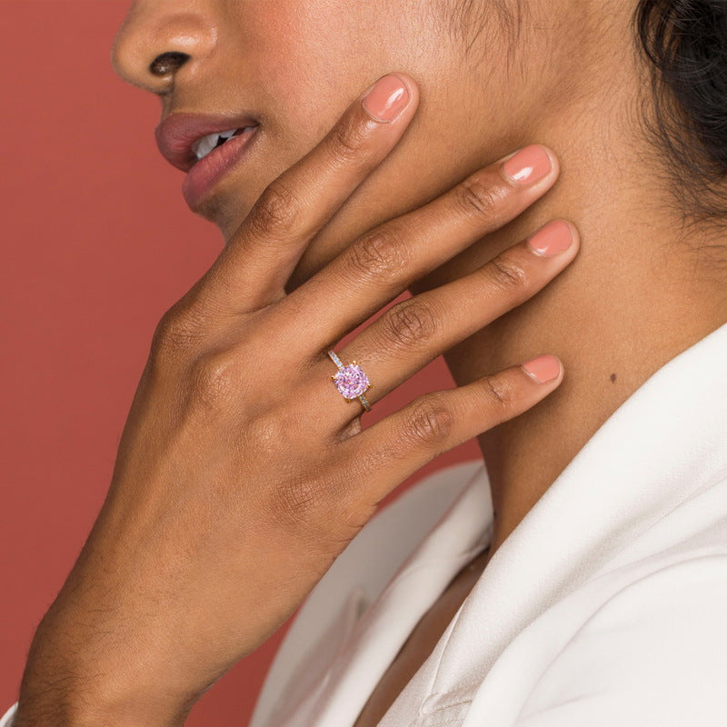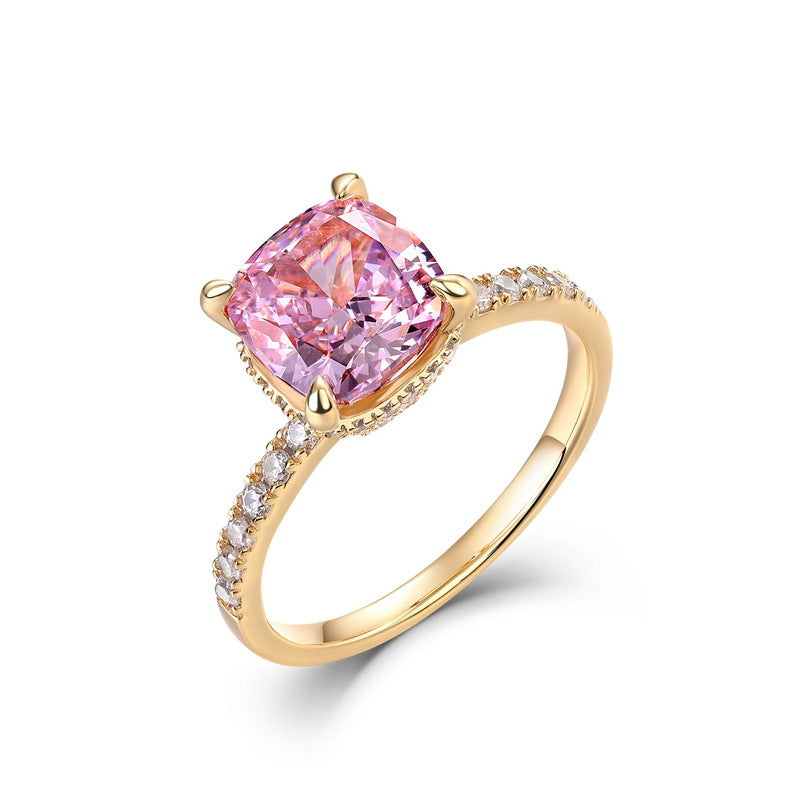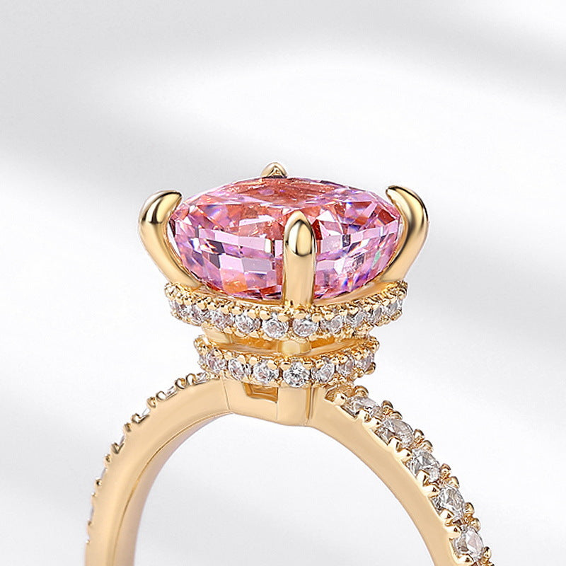 Materials: 925 sterling silver base, 18K gold plating, high-carbon pink center stone, moissanites.