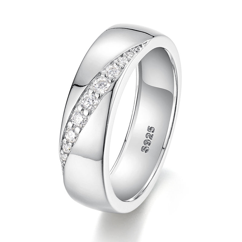 Halsten is confidence made simple. Crafted from 925 sterling silver, this wide-band ring features a clean, modern silhouette with a precise channel of moissanites across its center. The polished surface reflects light with quiet power, while the stone setting adds just the right touch of brilliance. Built to last and made to stand out, Halsten is for those who value substance with style.