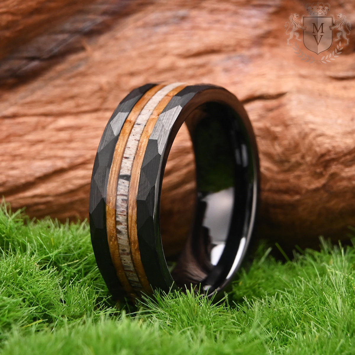 Huntress is a tribute to nature’s raw beauty and resilience. Crafted from sleek black tungsten carbide, this ring is inlaid with genuine antler, symbolizing strength, tradition, and a deep connection to the wild. Designed for those who embrace adventure and the call of the wilderness, its bold contrast and organic textures make it a statement of rugged elegance.