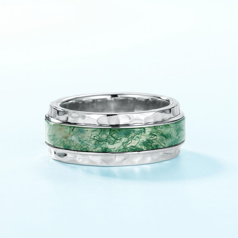 Maelorin is strength shaped by nature. Crafted from 925 sterling silver, its wide hammered band is set with a smooth inlay of natural moss agate — each piece uniquely marbled with green, like wild roots beneath glass. The contrast of rugged texture and polished edges makes Maelorin a bold yet grounded piece, made for those who carry calm with quiet power.