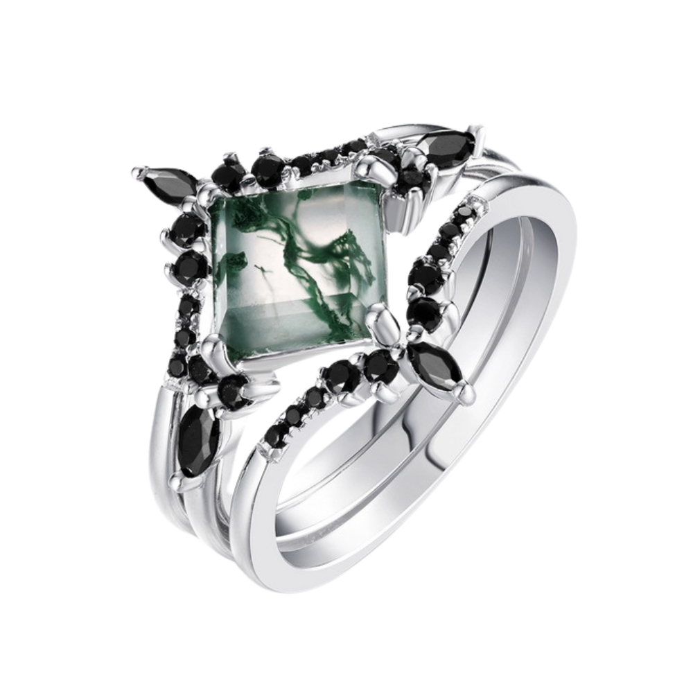 Mirael is a ring of quiet strength and natural beauty. At its center rests a 7x7mm square-cut moss agate — each one with its own living pattern, like branches suspended in light. Set in 925 sterling silver and framed by black crystal accents, the three-band design offers layered elegance and styling versatility. Whether worn stacked or spread across fingers, Mirael is made for those who carry the forest with them.
