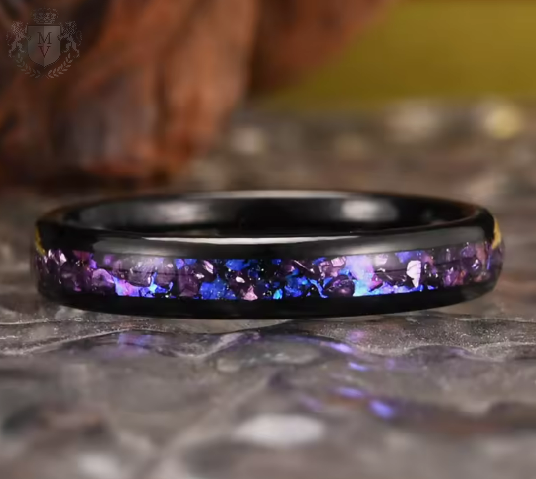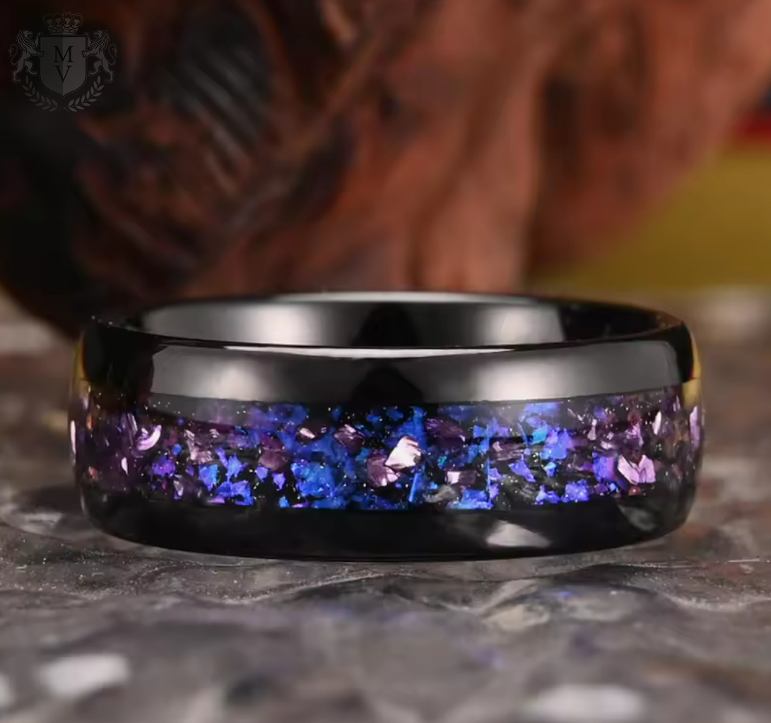 Solenox is a study in contrast — deep space tones wrapped in a mirror-black finish. Forged from polished black tungsten, its curved band glows with a vibrant inlay of violet crystal and shimmering blue foil, shifting like starlight across a galaxy’s edge. Available in both 8mm and 4mm widths, Solenox captures the quiet power of orbit — bold, fluid, and timeless.