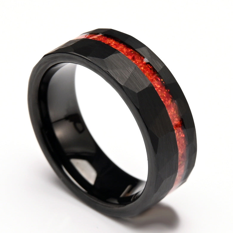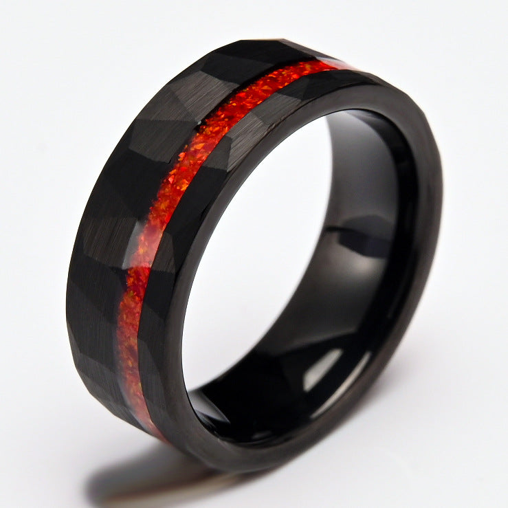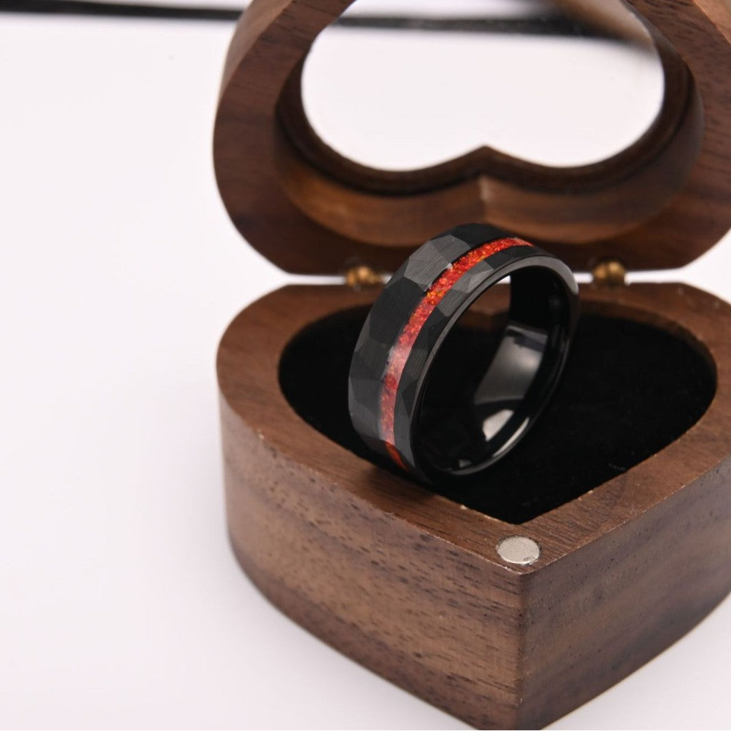 Sorex is a bold statement of passion and resilience. Forged from black tungsten carbide with a rugged hammered finish, it showcases a vivid red opal inlay that shimmers like embers in motion. The faceted edges catch the light with every movement, while the deep black body creates a striking contrast against the fiery center. Designed for those who carry both intensity and purpose, this ring is as unyielding as it is unforgettable.