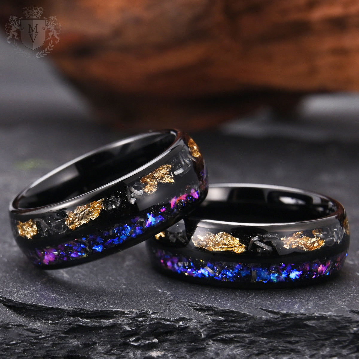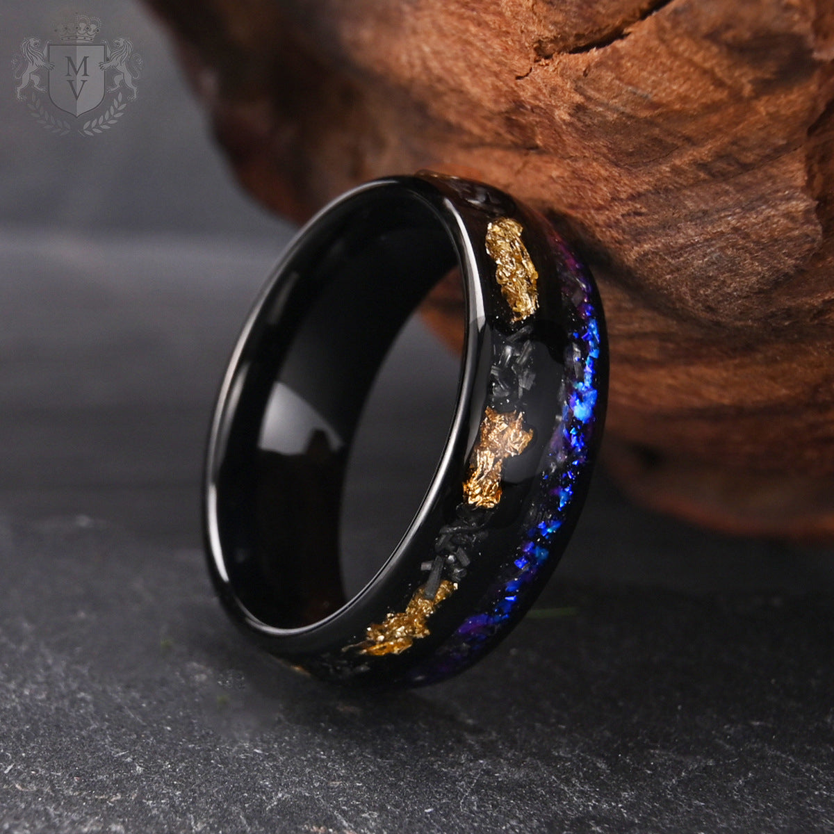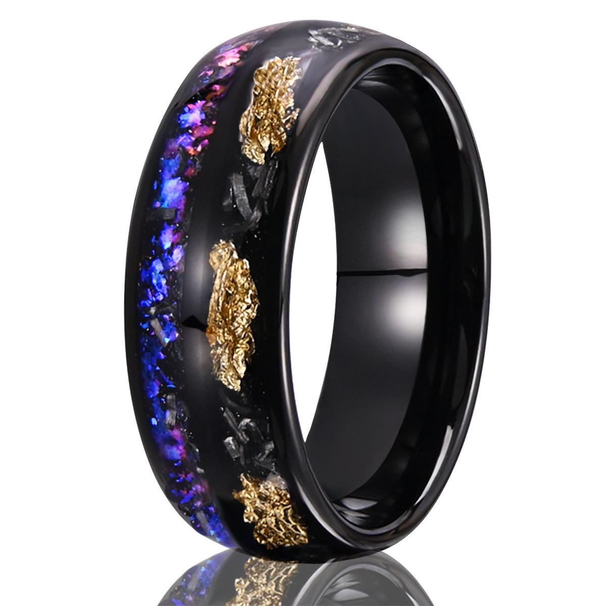 Valthera is a ring born from stardust and shadow. Forged in sleek black tungsten, its surface holds a mesmerizing inlay of crushed opal, gold foil, and meteorite fragments — each element glowing like a nebula trapped in motion. The 8mm band delivers a bold, modern profile while the cosmic design tells a story of depth, mystery, and resilience. Valthera is for those who move with purpose — quiet, radiant, and unstoppable.