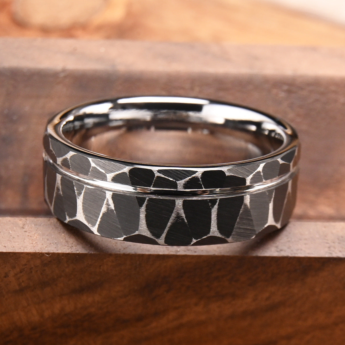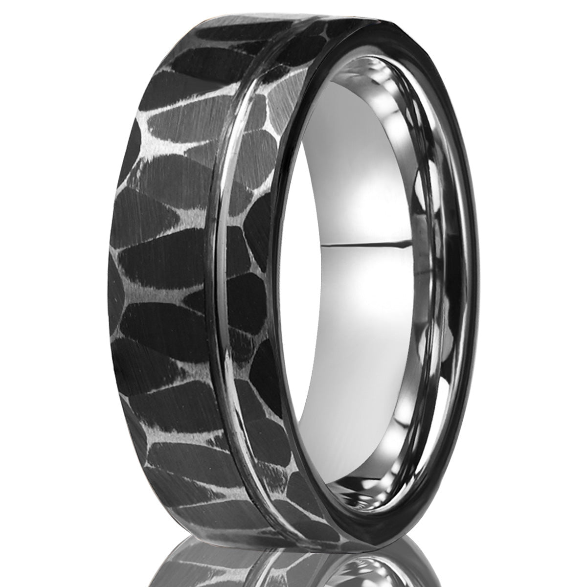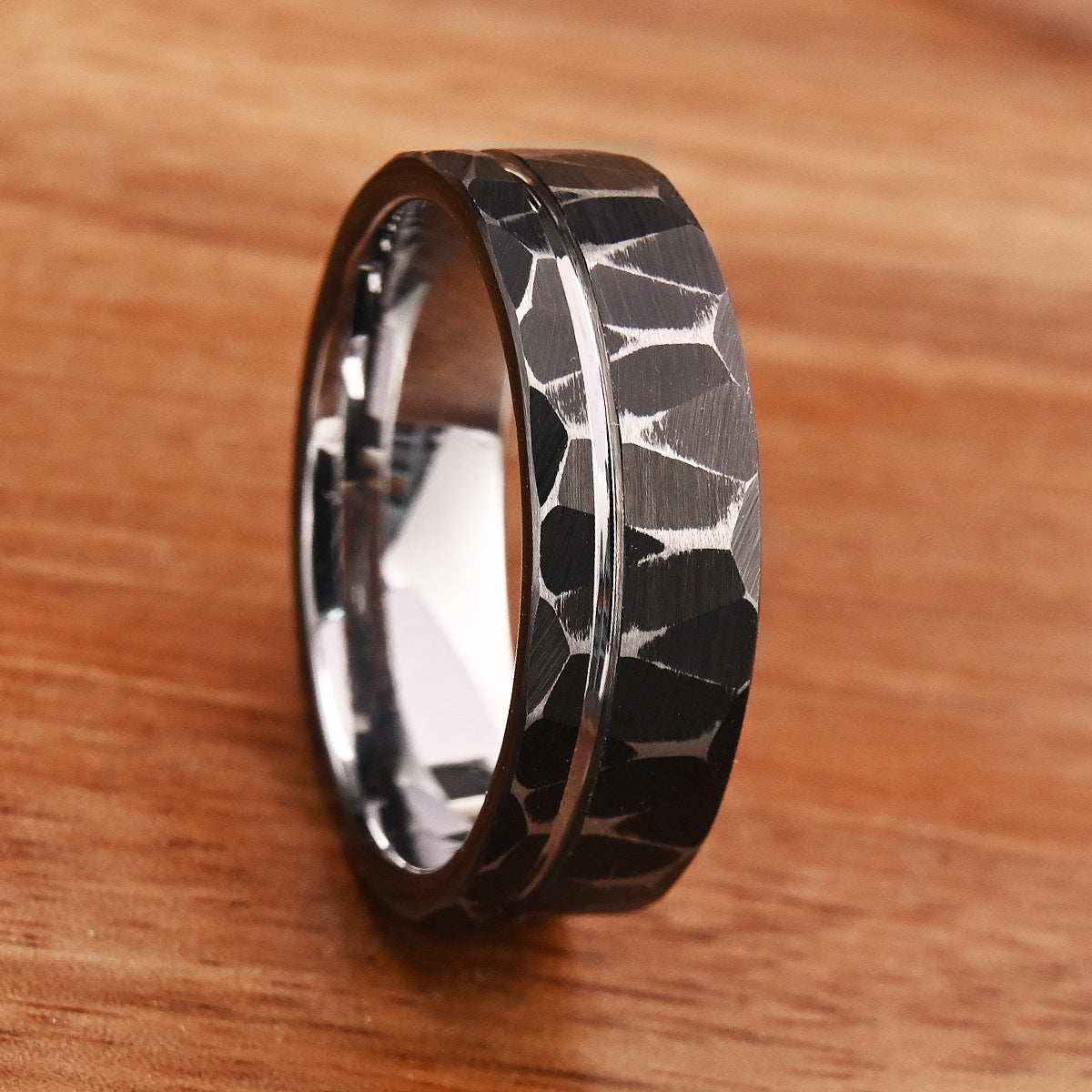 Vorrick is a testament to raw craftsmanship. Made from premium tungsten carbide, its surface features a bold hammered texture with a deep black antiqued finish, giving it a rugged yet refined character. The flat profile adds a contemporary feel, while the unique pattern ensures no two rings are exactly alike. Built for resilience and style, Vorrick is the perfect choice for those who value strength with understated elegance.